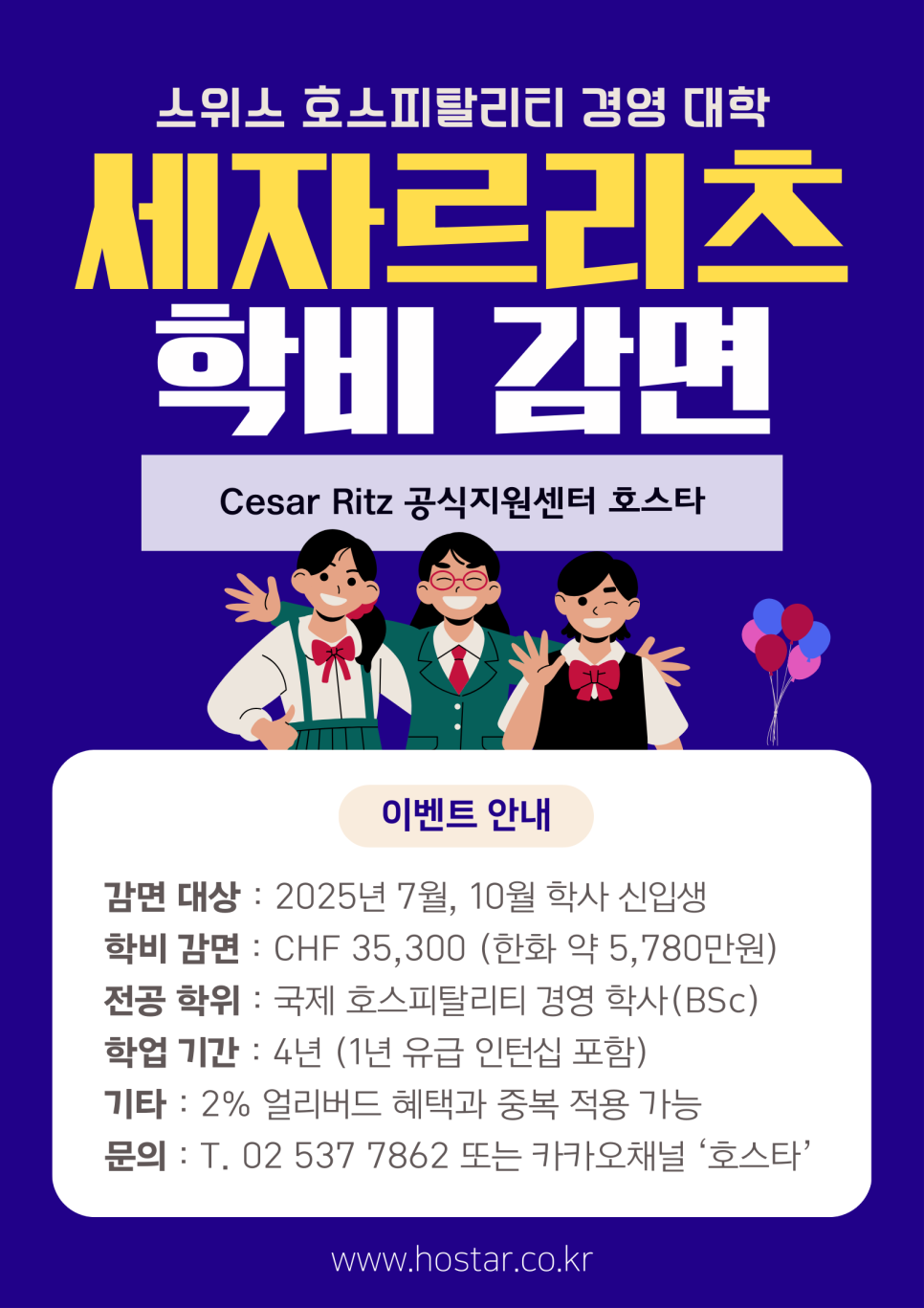 스위스 연방 정부의 인가를 받은 세자르리츠 호텔·호스피탈리티 경영대학이, 2025년 7월과 10월 입학 예정인 학사 과정 학생들을 대상?으로 한시적 특별 장학금을 제공합니다.